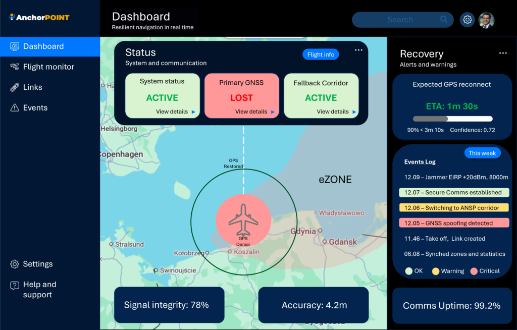 Detects GNSS jamming and spoofing in real time and alerts the flight crew immediately. The system distinguishes between signal loss and active manipulation, providing actionable awareness rather than a simple flag.